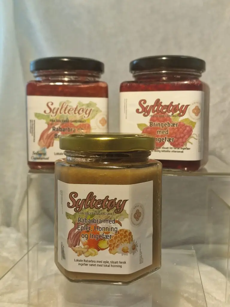Bringebærsyltetøy med ingefær Et friskt og smakfullt syltetøy laget med bringebær fra Tveita Gardsmat, tilsatt litt fersk ingefær som gir en deilig og lett sterk ettersmak.Ingredienser: Bringebær (75 %), sukker, jam, fersk ingefærStort glass (380 ml) – 119 kr / Lite glass (200 ml) – 79 kr Rabarbrasyltetøy med mye ingefær (sukkerfri) Et syltetøy med […]